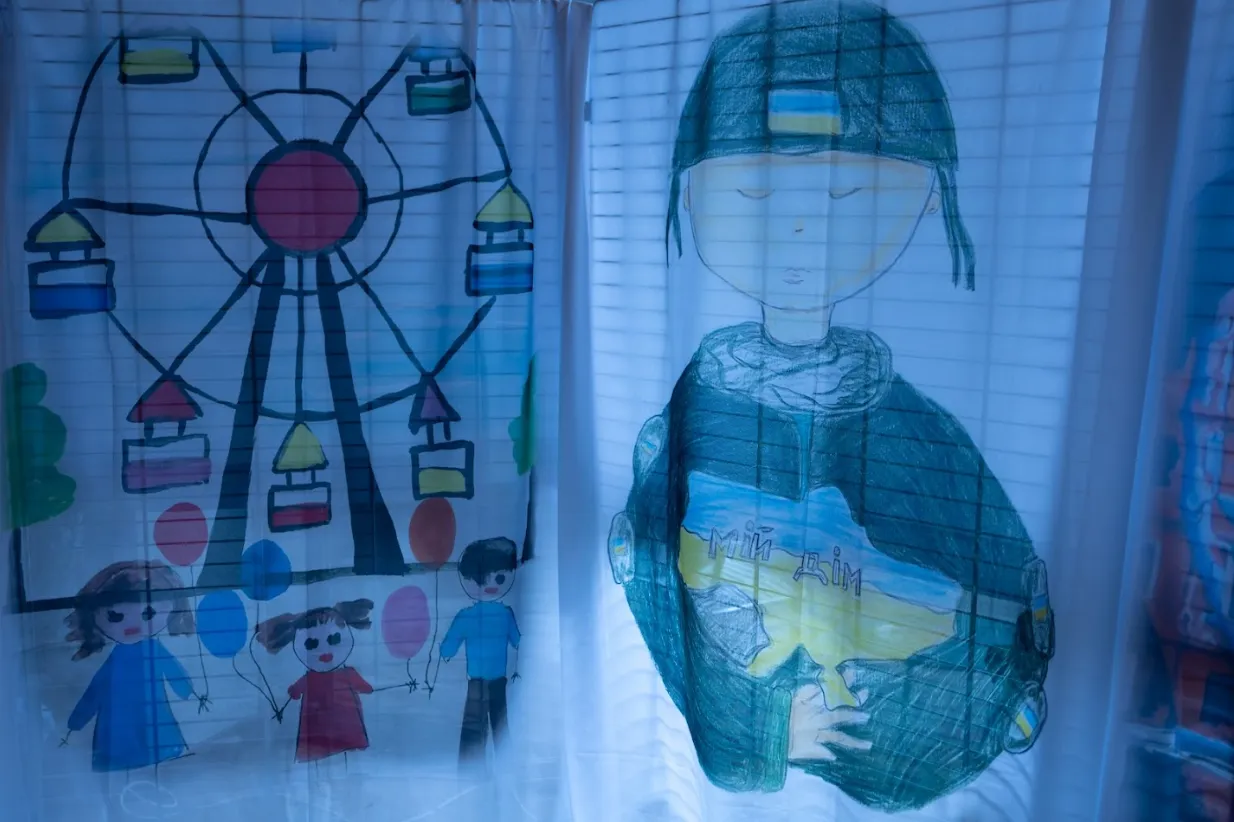 Дитячі малюнки на вітрилах, створені після пережитої окупації. Образ Драмтеатру, знищеного разом із людьми всередині. Відеоінсталяція, що демонструє, яким було місто і що з ним сталося.
